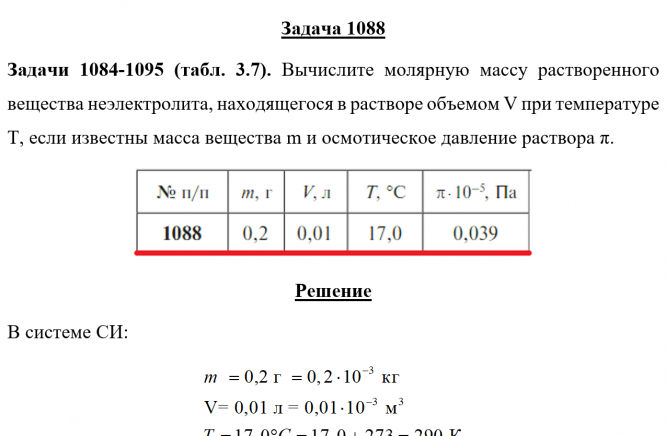 Задача 1088 - Вычислите молярную массу растворенного вещества неэлектролита, находящегося в растворе объемом V при температуре Т, если известны масса вещества m и осмотическое давление раствора π.