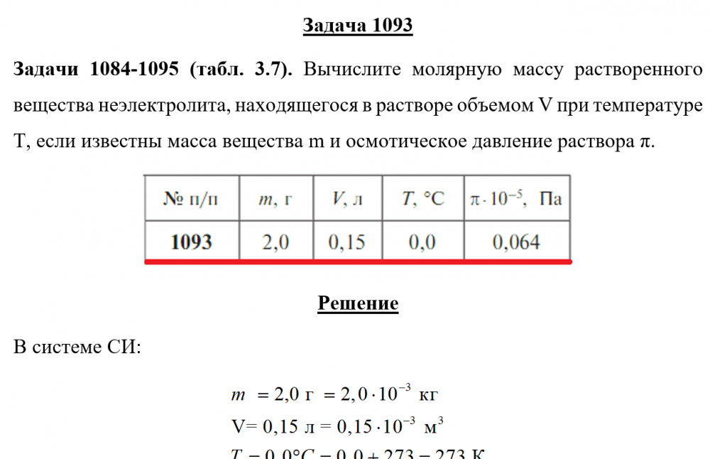 Задача 1093 - Вычислите молярную массу растворенного вещества неэлектролита, находящегося в растворе объемом V при температуре Т, если известны масса вещества m и осмотическое давление раствора π.