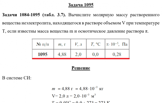 Задачи 1084-1095 (табл. 3.7). Вычислите молярную массу растворенного вещества неэлектролита, находящегося в растворе объемом V при температуре Т, если известны масса вещества m и осмотическое давление раствора π.