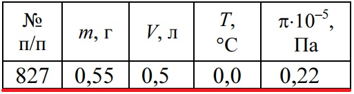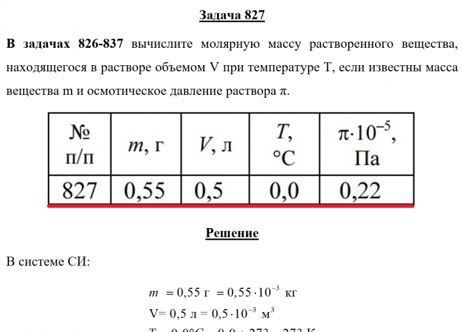 Задача 827 - вычислите молярную массу растворенного вещества, находящегося в растворе объемом V при температуре Т, если известны масса вещества m и осмотическое давление раствора π.