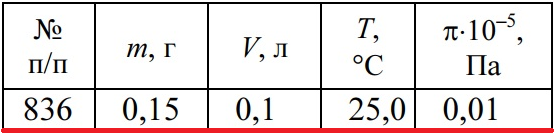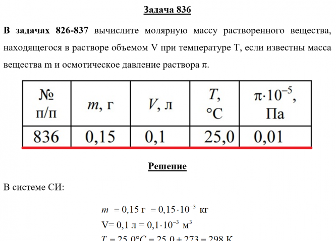 Задача 836 - вычислите молярную массу растворенного вещества, находящегося в растворе объемом V при температуре Т, если известны масса вещества m и осмотическое давление раствора π.