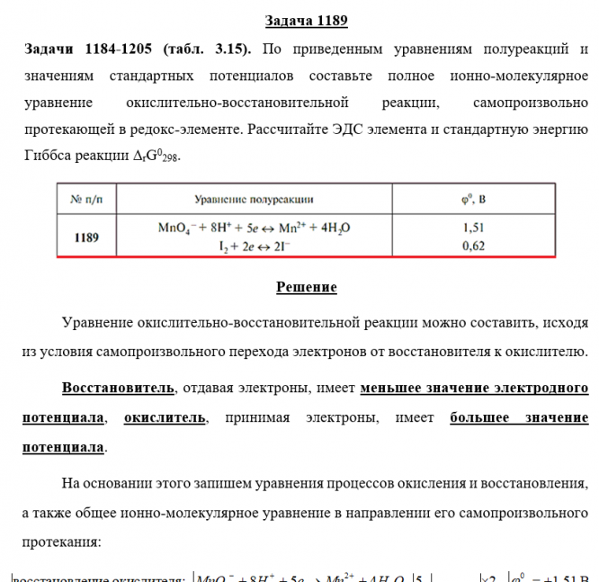 Для студентов по предмету ХимияЗадача 1189 - По приведенным уравнениям полуреакций и значениям стандартных электродных потенциалов составьте полное ионно-молекулярное уравнение окисЗадача 1189 - По приведенным уравнениям полуреакций и значениям стандартных электродных потенциалов составьте полное ионно-молекулярное уравнение окис