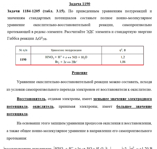 Задачи 1184-1205 (табл. 3.15). По приведенным уравнениям полуреакций и значениям стандартных электродных потенциалов составьте полное ионно-молекулярное уравнение окислительно-восстановительной реакции, самопроизвольно протекающей в редокс-элементе. Рассчитайте ЭДС элемента и стандартную энергию Гиббса реакции ΔrG0298
