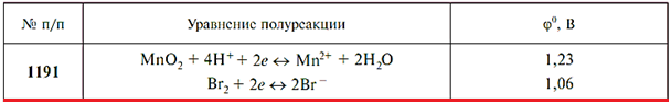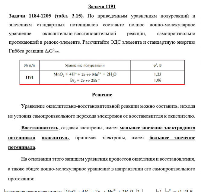 Задача 1191 - По приведенным уравнениям полуреакций и значениям стандартных электродных потенциалов составьте полное ионно-молекулярное уравнение окислительно-восстановительной реакции, самопроизвольно протекающей в редоксэлементе. Рассчитайте ЭДС эл