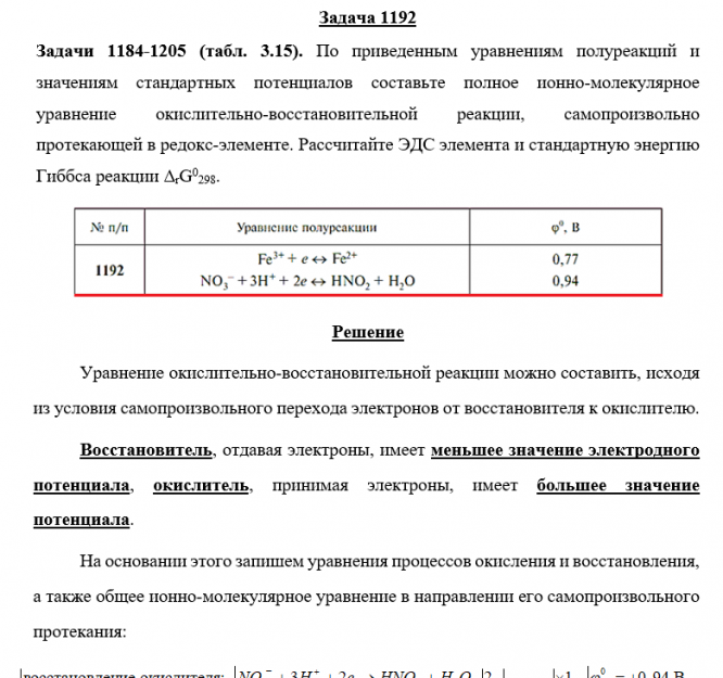 Задачи 1184-1205 (табл. 3.15). По приведенным уравнениям полуреакций и значениям стандартных электродных потенциалов составьте полное ионно-молекулярное уравнение окислительно-восстановительной реакции, самопроизвольно протекающей в редокс-элементе. Рассчитайте ЭДС элемента и стандартную энергию Гиббса реакции ΔrG0298