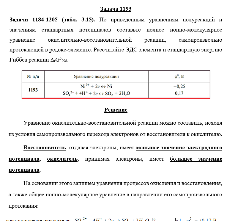 Задача 1193 - По приведенным уравнениям полуреакций и значениям стандартных электродных потенциалов составьте полное ионно-молекулярное уравнение окислительно-восстановительной реакции, самопроизвольно протекающей в редоксэлементе. Рассчитайте ЭДС эл