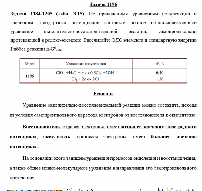 Задача 1196 - По приведенным уравнениям полуреакций и значениям стандартных электродных потенциалов составьте полное ионно-молекулярное уравнение окислительно-восстановительной реакции, самопроизвольно протекающей в редоксэлементе. Рассчитайте ЭДС эл