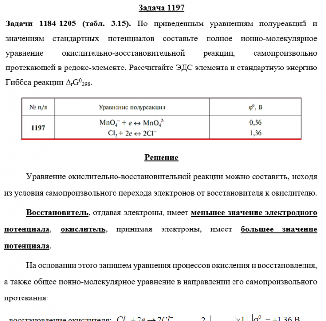 Для студентов по предмету ХимияЗадача 1197 - По приведенным уравнениям полуреакций и значениям стандартных электродных потенциалов составьте полное ионно-молекулярное уравнение окисЗадача 1197 - По приведенным уравнениям полуреакций и значениям стандартных электродных потенциалов составьте полное ионно-молекулярное уравнение окис