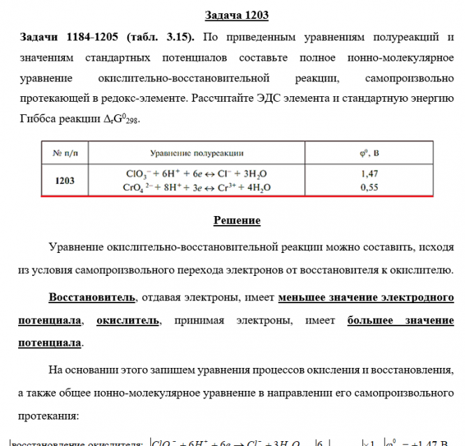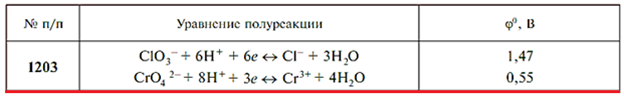 Задача 1203 - По приведенным уравнениям полуреакций и значениям стандартных электродных потенциалов составьте полное ионно-молекулярное уравнение окислительно-восстановительной реакции, самопроизвольно протекающей в редоксэлементе. Рассчитайте ЭДС эл