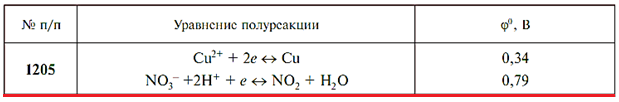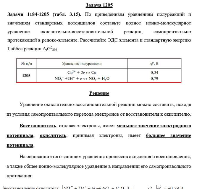 Задача 1205 - По приведенным уравнениям полуреакций и значениям стандартных электродных потенциалов составьте полное ионно-молекулярное уравнение окислительно-восстановительной реакции, самопроизвольно протекающей в редоксэлементе. Рассчитайте ЭДС эл