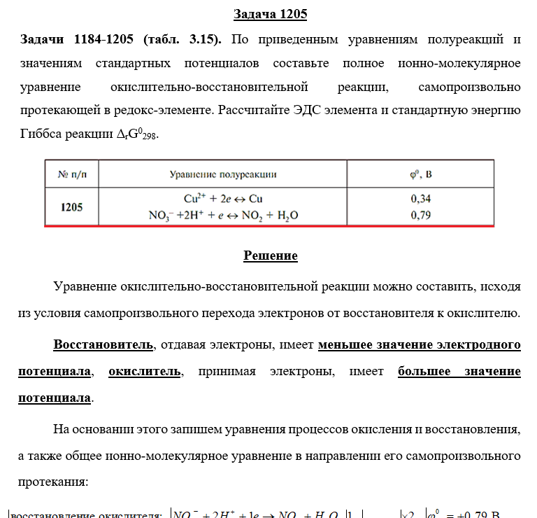 Для студентов по предмету ХимияЗадача 1205 - По приведенным уравнениям полуреакций и значениям стандартных электродных потенциалов составьте полное ионно-молекулярное уравнение окисЗадача 1205 - По приведенным уравнениям полуреакций и значениям стандартных электродных потенциалов составьте полное ионно-молекулярное уравнение окис