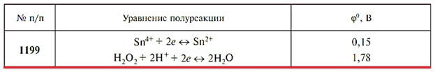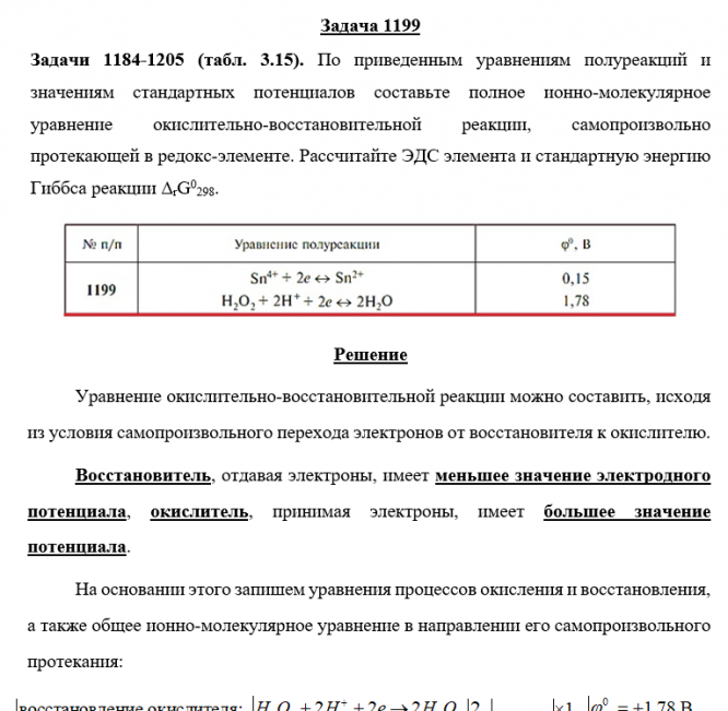 Задача 1199 - По приведенным уравнениям полуреакций и значениям стандартных электродных потенциалов составьте полное ионно-молекулярное уравнение окислительно-восстановительной реакции, самопроизвольно протекающей в редоксэлементе. Рассчитайте ЭДС эл