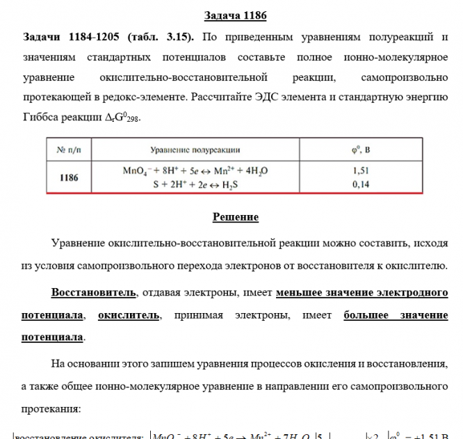 Для студентов по предмету ХимияЗадача 1186 - По приведенным уравнениям полуреакций и значениям стандартных электродных потенциалов составьте полное ионно-молекулярное уравнение окисЗадача 1186 - По приведенным уравнениям полуреакций и значениям стандартных электродных потенциалов составьте полное ионно-молекулярное уравнение окис