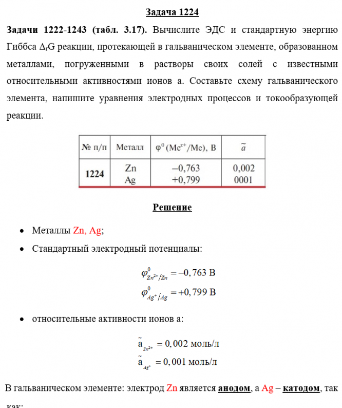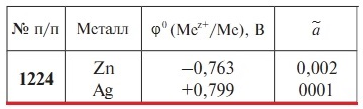 Задача 1224 - Вычислите ЭДС и стандартную энергию Гиббса ΔrG реакции, протекающей в гальваническом элементе, образованном металлами, погруженными в растворы своих солей с известными относительными активностями ионов a. Составьте схему гальванического