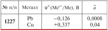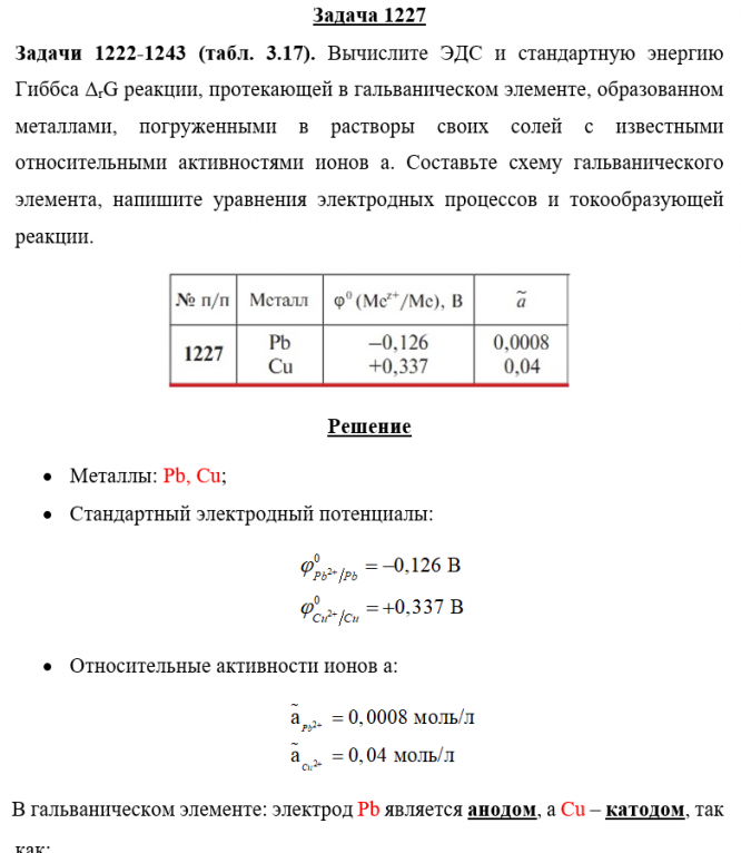 Задача 1227 - Вычислите ЭДС и стандартную энергию Гиббса ΔrG реакции, протекающей в гальваническом элементе, образованном металлами, погруженными в растворы своих солей с известными относительными активностями ионов a. Составьте схему гальванического