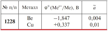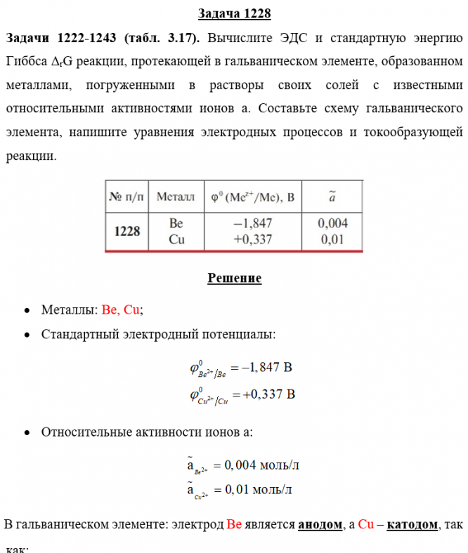 Задача 1228 - Вычислите ЭДС и стандартную энергию Гиббса ΔrG реакции, протекающей в гальваническом элементе, образованном металлами, погруженными в растворы своих солей с известными относительными активностями ионов a. Составьте схему гальванического