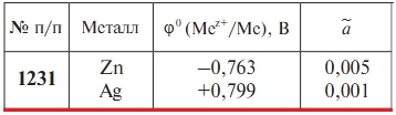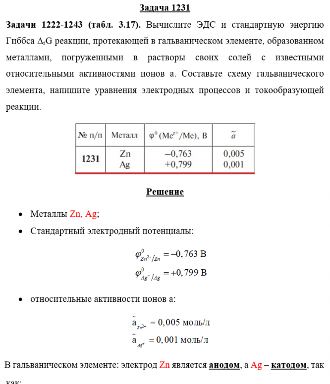 Задача 1231 - Вычислите ЭДС и стандартную энергию Гиббса ΔrG реакции, протекающей в гальваническом элементе, образованном металлами, погруженными в растворы своих солей с известными относительными активностями ионов a. Составьте схему гальванического