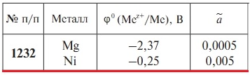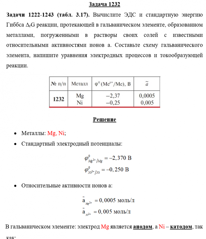 Задача 1232 - Вычислите ЭДС и стандартную энергию Гиббса ΔrG реакции, протекающей в гальваническом элементе, образованном металлами, погруженными в растворы своих солей с известными относительными активностями ионов a. Составьте схему гальванического