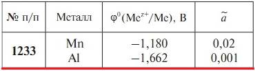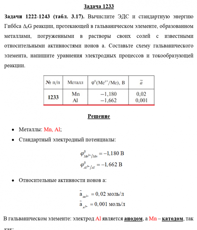 Задача 1233 - Вычислите ЭДС и стандартную энергию Гиббса ΔrG реакции, протекающей в гальваническом элементе, образованном металлами, погруженными в растворы своих солей с известными относительными активностями ионов a. Составьте схему гальванического