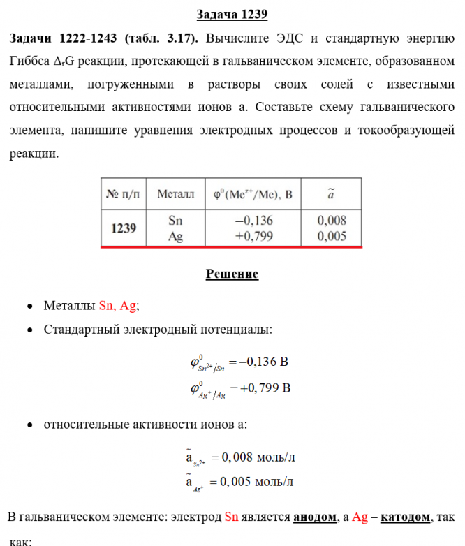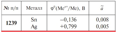 Задача 1239 - Вычислите ЭДС и стандартную энергию Гиббса ΔrG реакции, протекающей в гальваническом элементе, образованном металлами, погруженными в растворы своих солей с известными относительными активностями ионов a. Составьте схему гальванического