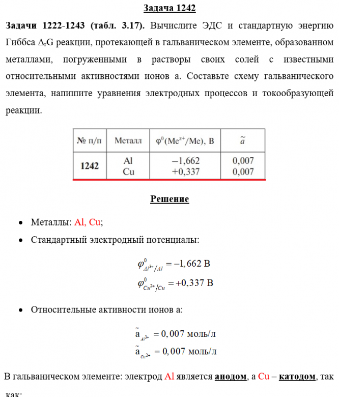 Задача 1242 - Вычислите ЭДС и стандартную энергию Гиббса ΔrG реакции, протекающей в гальваническом элементе, образованном металлами, погруженными в растворы своих солей с известными относительными активностями ионов a. Составьте схему гальванического