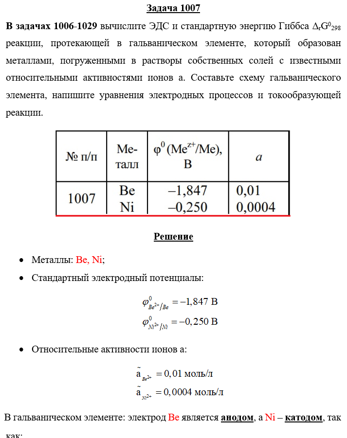 Задача 1007 - вычислите ЭДС и стандартную энергию Гиббса ΔrG0298 реакции, протекающей в гальваническом элементе, который образован металлами, погруженными в растворы собственных солей с известными относительными активностями ионов a. Составьте схему