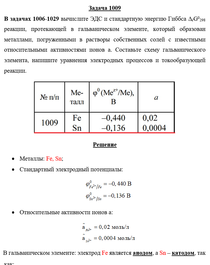 Задача 1009 - вычислите ЭДС и стандартную энергию Гиббса ΔrG0298 реакции, протекающей в гальваническом элементе, который образован металлами, погруженными в растворы собственных солей с известными относительными активностями ионов a. Составьте схему