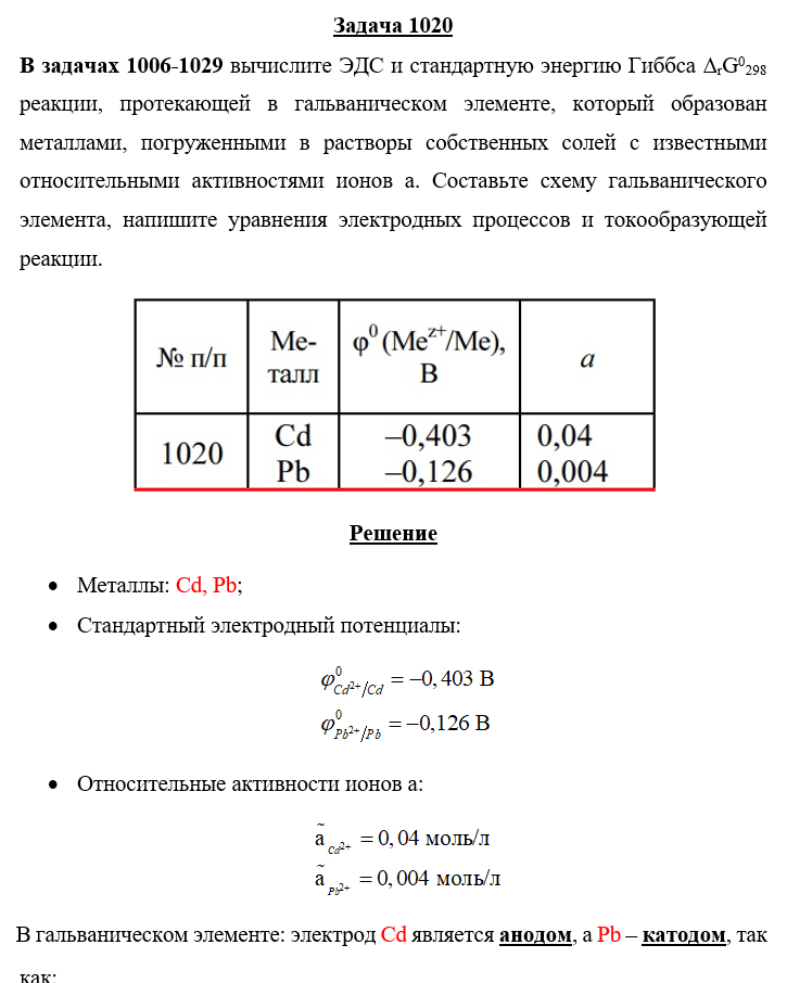 Для студентов по предмету ХимияЗадача 1020 - вычислите ЭДС и стандартную энергию Гиббса ΔrG0298 реакции, протекающей в гальваническом элементе, который образован металлами, погруженЗадача 1020 - вычислите ЭДС и стандартную энергию Гиббса ΔrG0298 реакции, протекающей в гальваническом элементе, который образован металлами, погружен