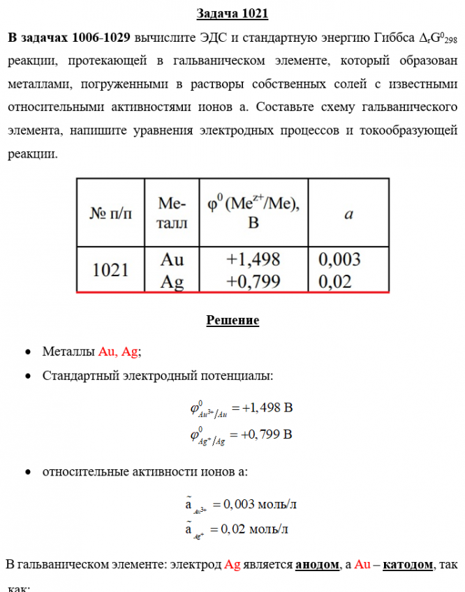 Главная » Учебные материалы » Химия » Решения задач » Несколько классов/семестров » Номер 1021 » Задача 1021 - вычислите ЭДС и стандартную энергию Гиббса ΔrG0298 реакции, протекающей в гальваническом элементе, который образован металлами, погруженными в растворы собственных солей с известными относительными активностями ионов a. Составьте схему