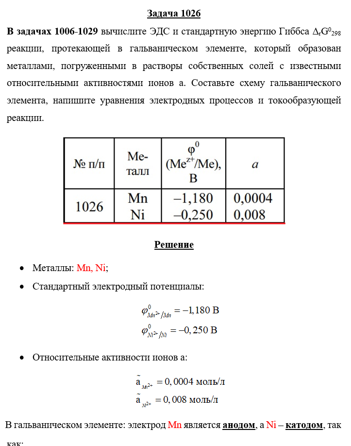 Для студентов по предмету ХимияЗадача 1026 - вычислите ЭДС и стандартную энергию Гиббса ΔrG0298 реакции, протекающей в гальваническом элементе, который образован металлами, погруженЗадача 1026 - вычислите ЭДС и стандартную энергию Гиббса ΔrG0298 реакции, протекающей в гальваническом элементе, который образован металлами, погружен
