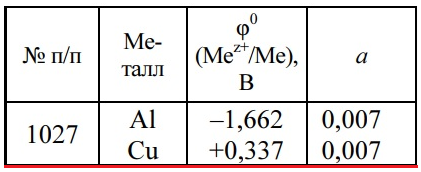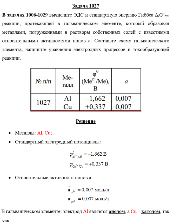 Задача 1027 - вычислите ЭДС и стандартную энергию Гиббса ΔrG0298 реакции, протекающей в гальваническом элементе, который образован металлами, погруженными в растворы собственных солей с известными относительными активностями ионов a. Составьте схему