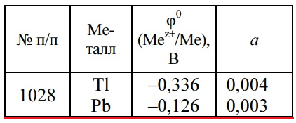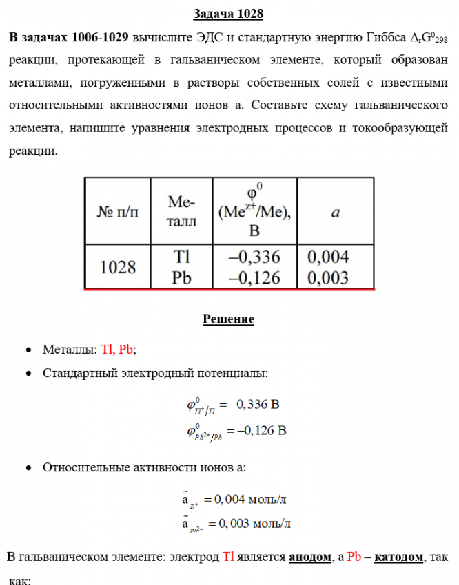 Задача 1028 - вычислите ЭДС и стандартную энергию Гиббса ΔrG0298 реакции, протекающей в гальваническом элементе, который образован металлами, погруженными в растворы собственных солей с известными относительными активностями ионов a. Составьте схему