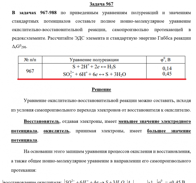 Для студентов по предмету ХимияЗадача 967 - по приведенным уравнениям полуреакций и значениям стандартных потенциалов составьте полное ионно-молекулярное уравнение окислительно-воссЗадача 967 - по приведенным уравнениям полуреакций и значениям стандартных потенциалов составьте полное ионно-молекулярное уравнение окислительно-восс