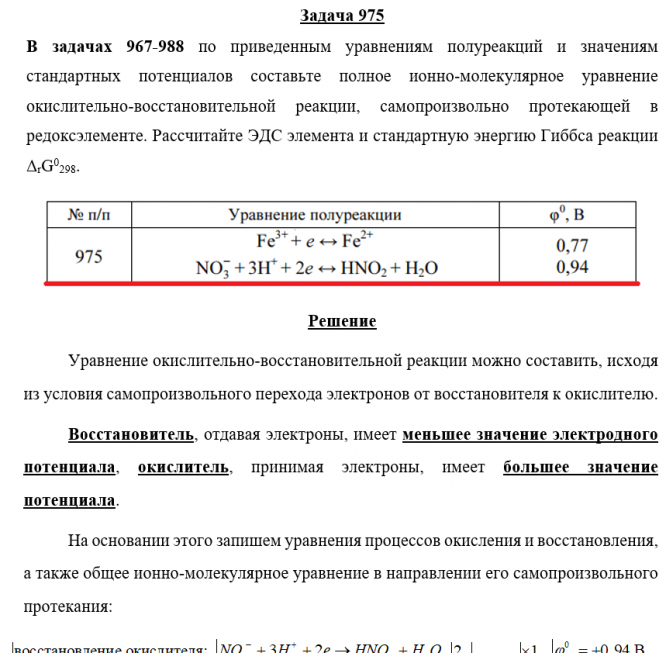 Для студентов по предмету ХимияЗадача 975 - по приведенным уравнениям полуреакций и значениям стандартных потенциалов составьте полное ионно-молекулярное уравнение окислительно-воссЗадача 975 - по приведенным уравнениям полуреакций и значениям стандартных потенциалов составьте полное ионно-молекулярное уравнение окислительно-восс
