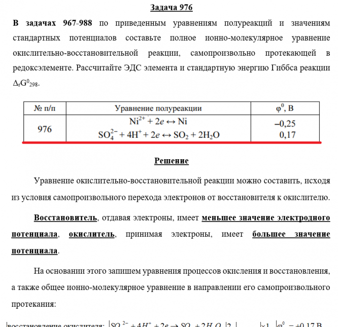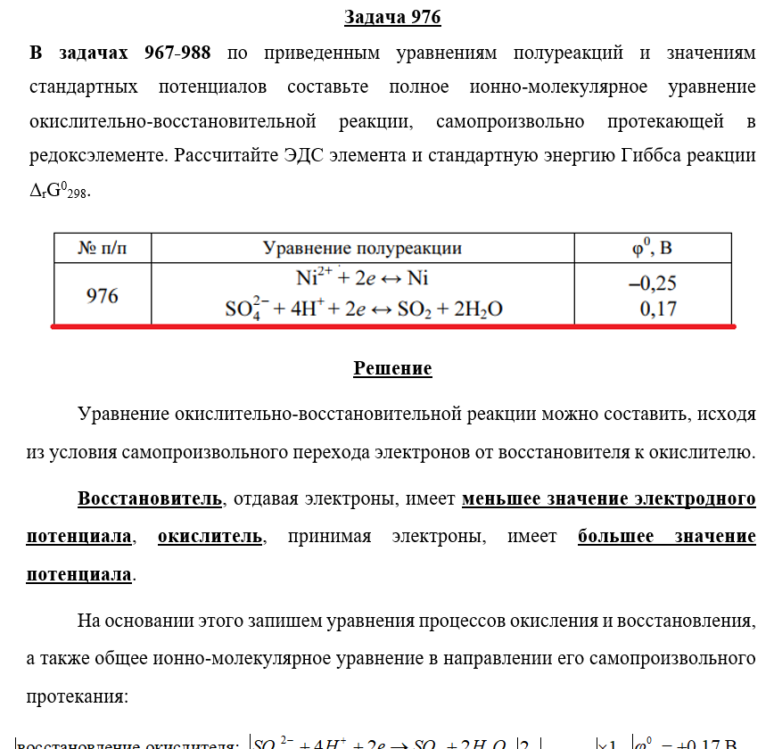 Для студентов по предмету ХимияЗадача 976 - по приведенным уравнениям полуреакций и значениям стандартных потенциалов составьте полное ионно-молекулярное уравнение окислительно-воссЗадача 976 - по приведенным уравнениям полуреакций и значениям стандартных потенциалов составьте полное ионно-молекулярное уравнение окислительно-восс