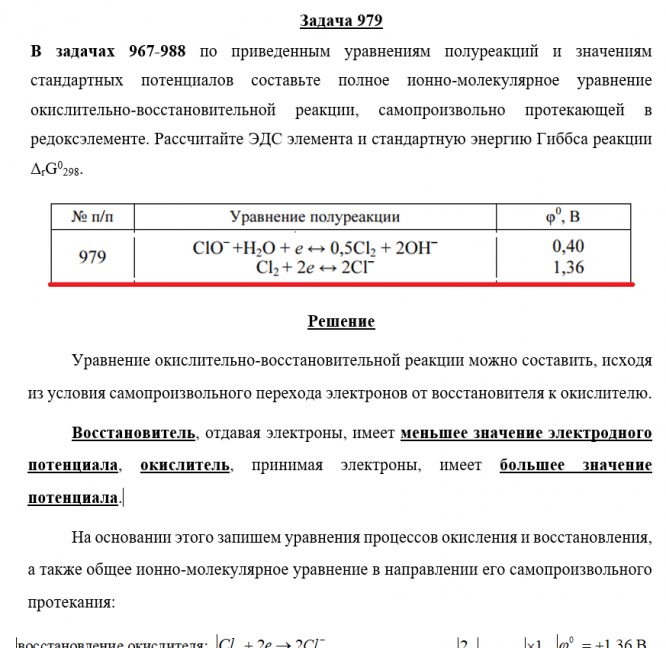 Для студентов по предмету ХимияЗадача 979 - по приведенным уравнениям полуреакций и значениям стандартных потенциалов составьте полное ионно-молекулярное уравнение окислительно-воссЗадача 979 - по приведенным уравнениям полуреакций и значениям стандартных потенциалов составьте полное ионно-молекулярное уравнение окислительно-восс