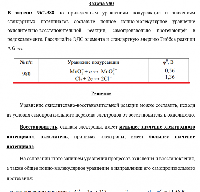 Для студентов по предмету ХимияЗадача 980 - по приведенным уравнениям полуреакций и значениям стандартных потенциалов составьте полное ионно-молекулярное уравнение окислительно-воссЗадача 980 - по приведенным уравнениям полуреакций и значениям стандартных потенциалов составьте полное ионно-молекулярное уравнение окислительно-восс