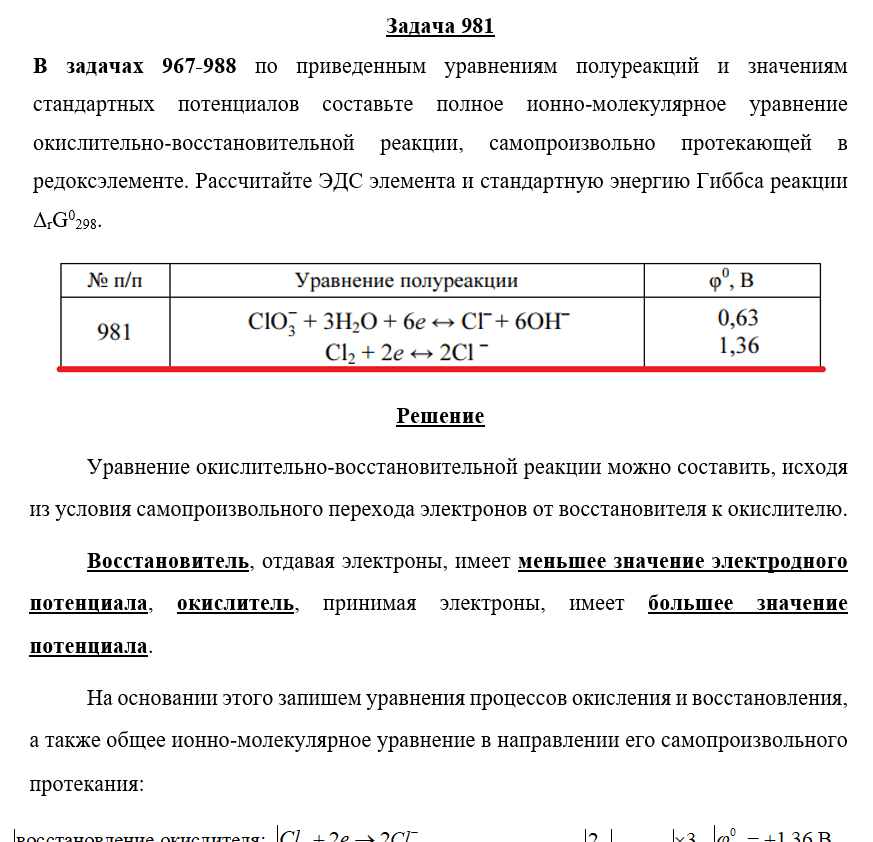 Для студентов по предмету ХимияЗадача 981 - по приведенным уравнениям полуреакций и значениям стандартных потенциалов составьте полное ионно-молекулярное уравнение окислительно-воссЗадача 981 - по приведенным уравнениям полуреакций и значениям стандартных потенциалов составьте полное ионно-молекулярное уравнение окислительно-восс