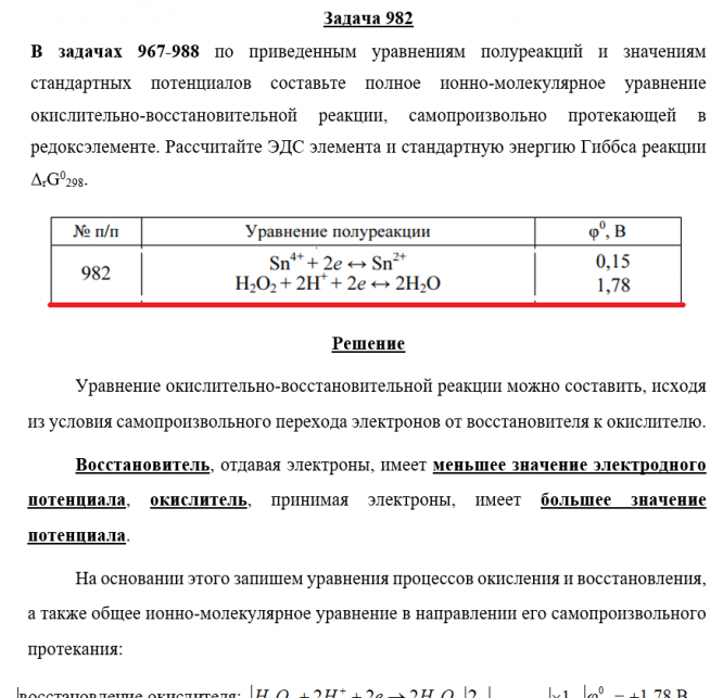 Для студентов по предмету ХимияЗадача 982 - по приведенным уравнениям полуреакций и значениям стандартных потенциалов составьте полное ионно-молекулярное уравнение окислительно-воссЗадача 982 - по приведенным уравнениям полуреакций и значениям стандартных потенциалов составьте полное ионно-молекулярное уравнение окислительно-восс