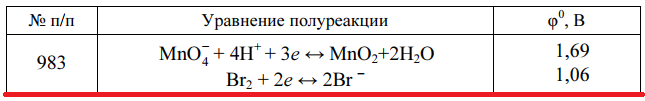 Задача 983 - по приведенным уравнениям полуреакций и значениям стандартных потенциалов составьте полное ионно-молекулярное уравнение окислительно-восстановительной реакции, самопроизвольно протекающей в редоксэлементе. Рассчитайте ЭДС элемента и стан