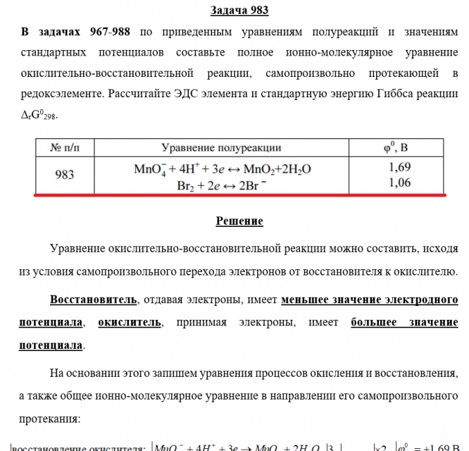 Для студентов по предмету ХимияЗадача 983 - по приведенным уравнениям полуреакций и значениям стандартных потенциалов составьте полное ионно-молекулярное уравнение окислительно-воссЗадача 983 - по приведенным уравнениям полуреакций и значениям стандартных потенциалов составьте полное ионно-молекулярное уравнение окислительно-восс