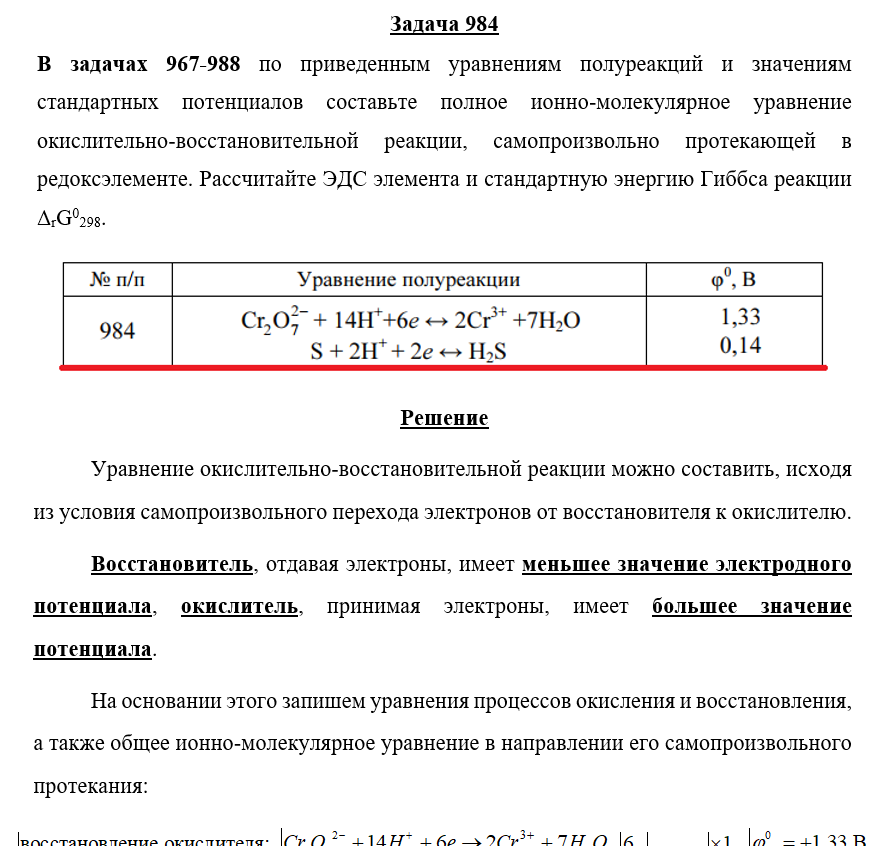 Для студентов по предмету ХимияЗадача 984 - по приведенным уравнениям полуреакций и значениям стандартных потенциалов составьте полное ионно-молекулярное уравнение окислительно-воссЗадача 984 - по приведенным уравнениям полуреакций и значениям стандартных потенциалов составьте полное ионно-молекулярное уравнение окислительно-восс