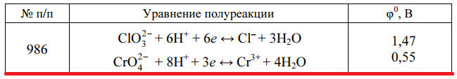 Задача 986 - по приведенным уравнениям полуреакций и значениям стандартных потенциалов составьте полное ионно-молекулярное уравнение окислительно-восстановительной реакции, самопроизвольно протекающей в редоксэлементе. Рассчитайте ЭДС элемента и стан