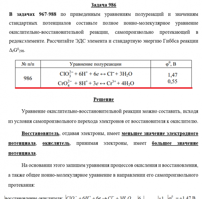 Для студентов по предмету ХимияЗадача 986 - по приведенным уравнениям полуреакций и значениям стандартных потенциалов составьте полное ионно-молекулярное уравнение окислительно-воссЗадача 986 - по приведенным уравнениям полуреакций и значениям стандартных потенциалов составьте полное ионно-молекулярное уравнение окислительно-восс