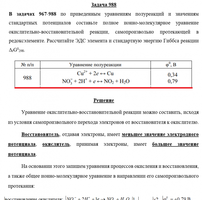 Задача 988 - по приведенным уравнениям полуреакций и значениям стандартных потенциалов составьте полное ионно-молекулярное уравнение окислительно-восстановительной реакции, самопроизвольно протекающей в редоксэлементе. Рассчитайте ЭДС элемента и стан