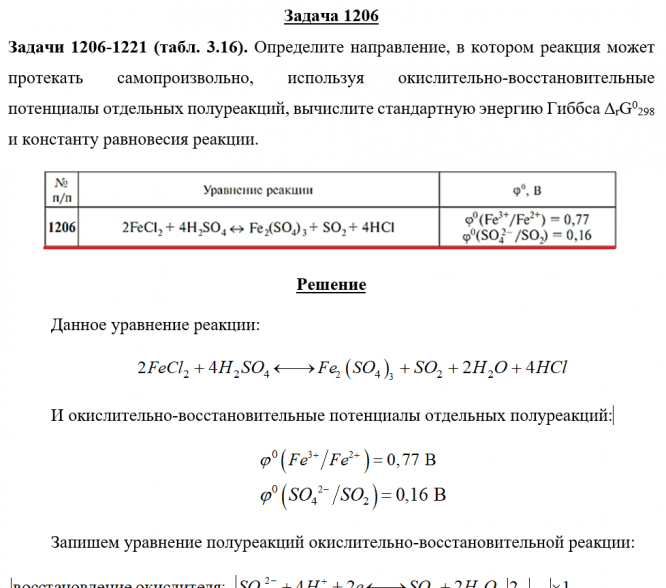 Задачи 1206-1221 (табл. 3.16). Определите направление, в котором реакция может протекать самопроизвольно, используя окислительно-восстановительные потенциалы отдельных полуреаций, вычислите стандартную энергию Гиббса ΔrG0298 и константу равновесия реакции..