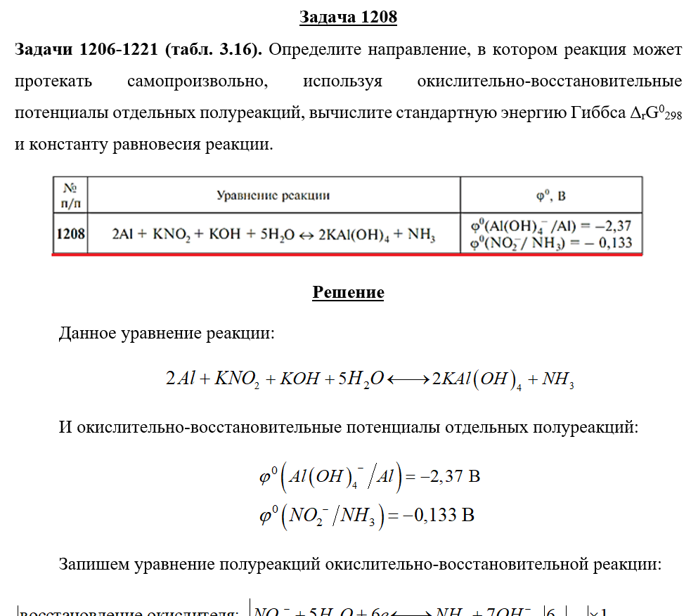 Задачи 1206-1221 (табл. 3.16). Определите направление, в котором реакция может протекать самопроизвольно, используя окислительно-восстановительные потенциалы отдельных полуреаций, вычислите стандартную энергию Гиббса ΔrG0298 и константу равновесия реакции.