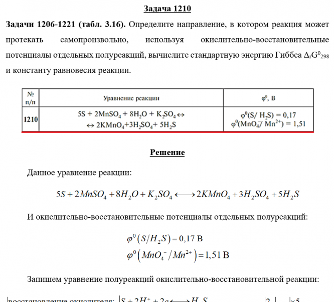 Задачи 1206-1221 (табл. 3.16). Определите направление, в котором реакция может протекать самопроизвольно, используя окислительно-восстановительные потенциалы отдельных полуреаций, вычислите стандартную энергию Гиббса ΔrG0298 и константу равновесия реакции..