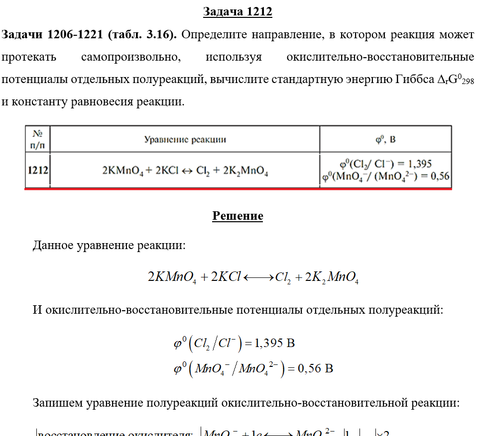Задачи 1206-1221 (табл. 3.16). Определите направление, в котором реакция может протекать самопроизвольно, используя окислительно-восстановительные потенциалы отдельных полуреаций, вычислите стандартную энергию Гиббса ΔrG0298 и константу равновесия реакции.