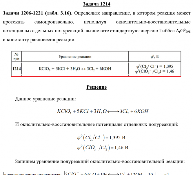 Задачи 1206-1221 (табл. 3.16). Определите направление, в котором реакция может протекать самопроизвольно, используя окислительно-восстановительные потенциалы отдельных полуреаций, вычислите стандартную энергию Гиббса ΔrG0298 и константу равновесия реакции.